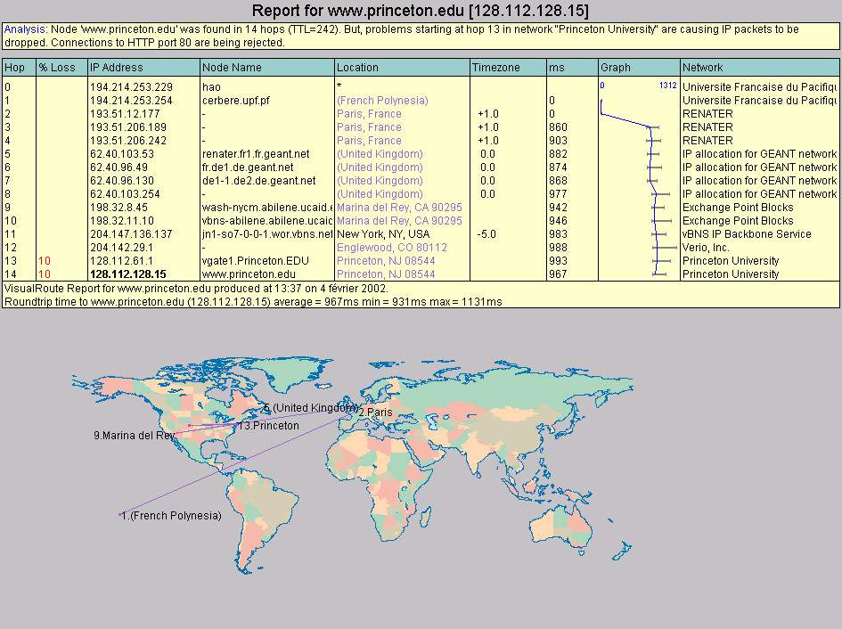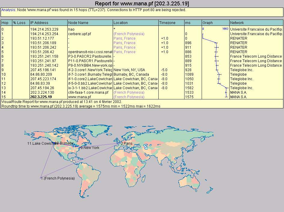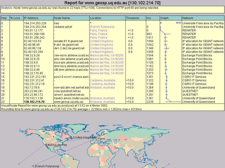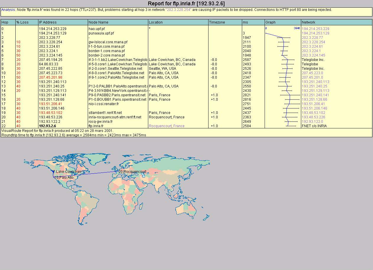 Plusieurs sites permettent d'utiliser cet excellent outil de diagnostic des connexions qu'est l'utilitaire tracert (dans le monde windows) ou traceroute (dans le monde Unix). Le site www.traceroute.org recense une bonne partie des sites permettant de mettre en oeuvre l'outil, par exemple le site traceroute de NIC France. Des logiciels graphiques spécialisés existent également, le plus connu étant probablement VisualRoute.