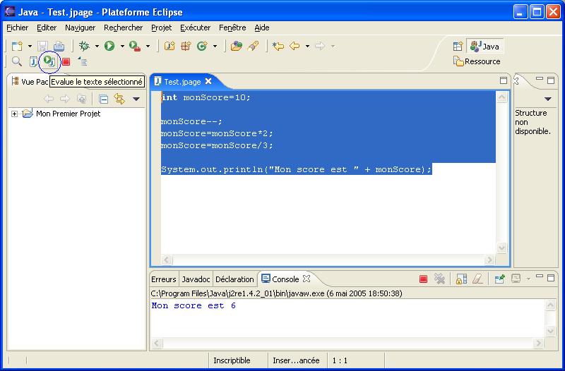 Qu'imprime ce code ? Eclipse a une fonctionnalité bien pratique appelée page de testeur de code, qui permet de tester rapidement n'importe quel bout de code (comme le précédent) sans même créer une classe. Sélectionne le menu Fichier, Nouveau, Autre., puis Java, Exécution/Débogage Java, Page de testeur de code et entre le mot Test comme nom de ta page.