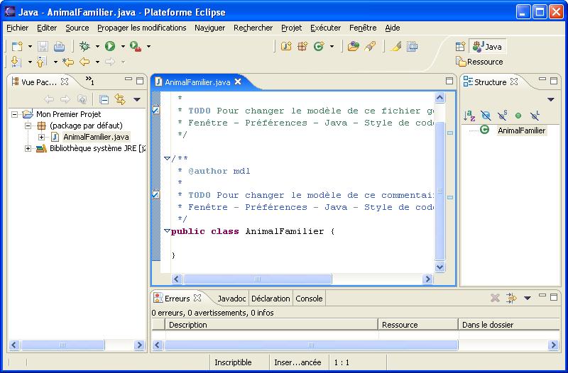 Commençons par créer une nouvelle classe Java nommée AnimalFamilier dans Mon Premier Projet comme décrit dans le chapitre 2, mais sans cocher la case de création de la méthode main().