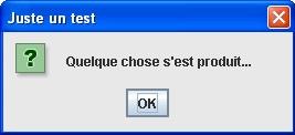Il y a différentes version de la méthode showConfirmDialog(). Nous allons utiliser celle qui prend quatre arguments. Dans le code ci-dessous, le mot-clé null signifie que cette boîte de message n'a pas de fenêtre mère, le deuxième argument contient le message, le troisième le titre de la boîte de message et le quatrième te permet de choisir le(s) bouton(s) à inclure dans la boîte (PLAIN_MESSAGE signifie que seul un bouton OK est affiché).