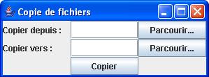 Crée un programme Swing qui permette à l'utilisateur de sélectionner les noms de fichiers à copier en utilisant la classe JFileChooser, qui crée une fenêtre standard de sélection de fichier. Cette fenêtre doit s'ouvrir quand l'utilisateur clique sur l'un des boutons Parcourir. Tu as quelques lignes de code à écrire pour afficher le nom de fichier sélectionné dans le champ textuel correspondant.