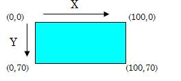 Dans une fenêtre, la coordonnée X augmente de la gauche vers la droite et la coordonnée Y augmente du haut vers le bas. Par exemple, les coordonnées des coins de ce rectangle de largeur 100 pixels et de hauteur 70 sont indiquées entre parenthèses :