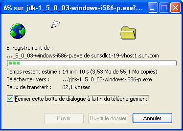 Une fois le téléchargement terminé, lance l'installation - double-clique simplement sur le fichier que tu as téléchargé pour installer J2SDK sur ton disque. Par exemple, sur une machine Windows, le programme d'installation créera un répertoire comme celui-ci : c:\Program Files\java\j2sdk1.5.0_03, oł c: est le nom de ton disque dur.