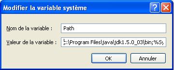 Clique sur le bouton Nouveau en bas de la fenêtre et déclare la variable Path qui permettra à Windows (ou Unix) de trouver J2SDK sur ta machine. Vérifie bien le nom du répertoire oł tu as installé Java. Si la variable Path existe déjà, clique sur le bouton Modifier et ajoute le nom complet du répertoire Java suivi d'un point-virgule au tout début de la boîte Valeur de la variable :
