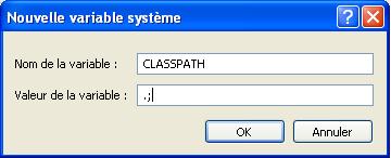 De même, déclare la variable CLASSPATH en entrant comme valeur un point suivi d'un point-virgule. Cette variable système permettra à Java de trouver tes programmes. Le point signifie que Java doit chercher tes programmes à partir du répertoire courant. Le point-virgule n'est qu'un séparateur :