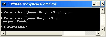 Le programme javac est le compilateur Java. Aucun message ne va te confirmer que ton programme BonjourMonde a bien été compilé. C'est le cas typique du "Pas de nouvelles, bonnes nouvelles". Tape la commande dir et tu verras la liste de tous les fichiers de ton répertoire. Tu devrais y trouver un nouveau fichier nommé BonjourMonde.class. Ca prouve que ton programme a bien été compilé. Ton fichier d'origine, BonjourMonde.java, est là aussi, et tu pourras le modifier plus tard pour afficher "Bonjour Maman" ou autre chose.