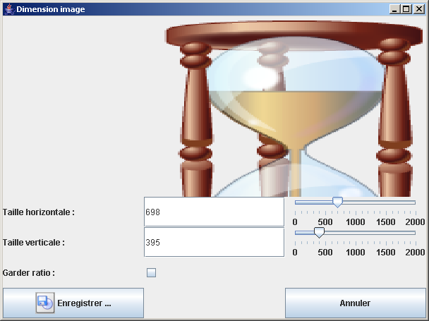 - un click sur "Enregistrer ..." entraînera l'affichage d'une fenêtre de choix de fichier et l'enregistrement de l'image redimensionnée (utilisez ImageIO.write(...))